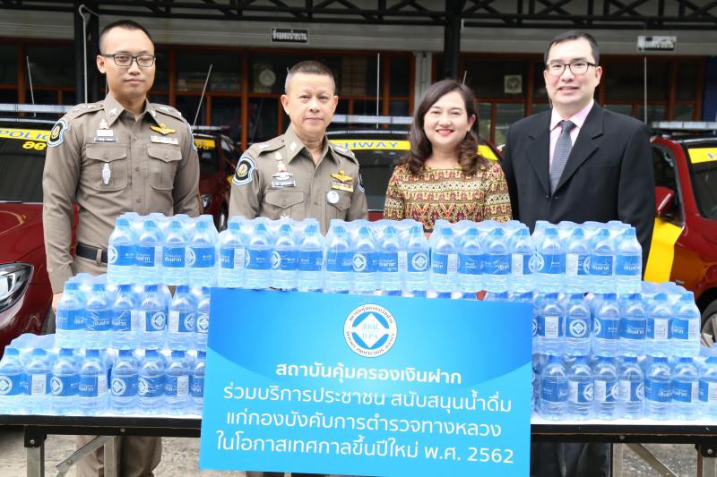 นางปิยาภรณ์ โพธ์กลิ่น ผู้ช่วยผู้อำนวยการ สายกลยุทธ์ ผู้แทนสถาบันคุ้มครองเงินฝาก ร่วมบริการประชาชน สนับสนุนน้ำดื่มแก่ พล.ต.ต.ชัช สุกแก้ว ณรงค์ ผบก.ทล.กองบังคับการตำรวจทางหลวง จำนวน 8,000 ขวดในโอกาสเทศกาลขึ้นปีใหม่ พ.ศ. 2562
